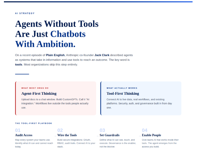 On a recent episode of Plain English, Anthropic co-founder Jack Clark described agents as systems that can take in information and use tools to reach an outcome. The key word in that framing is tools.