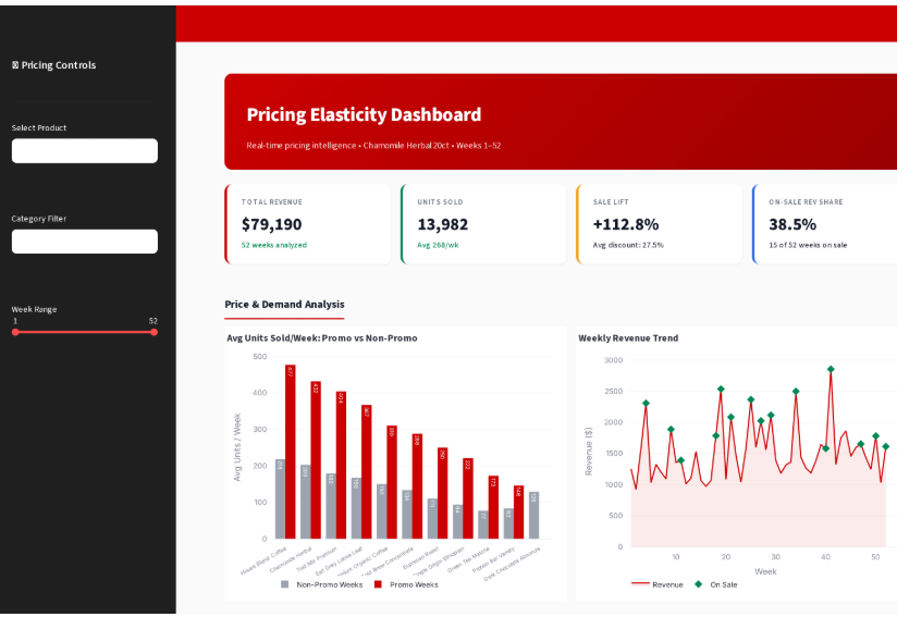 Four KPI cards update when you switch products. A dual-axis chart plots units sold against actual price week by week. A scatter plot computes the price elasticity coefficient with a trendline. A horizontal bar chart ranks all 12 products by elasticity.