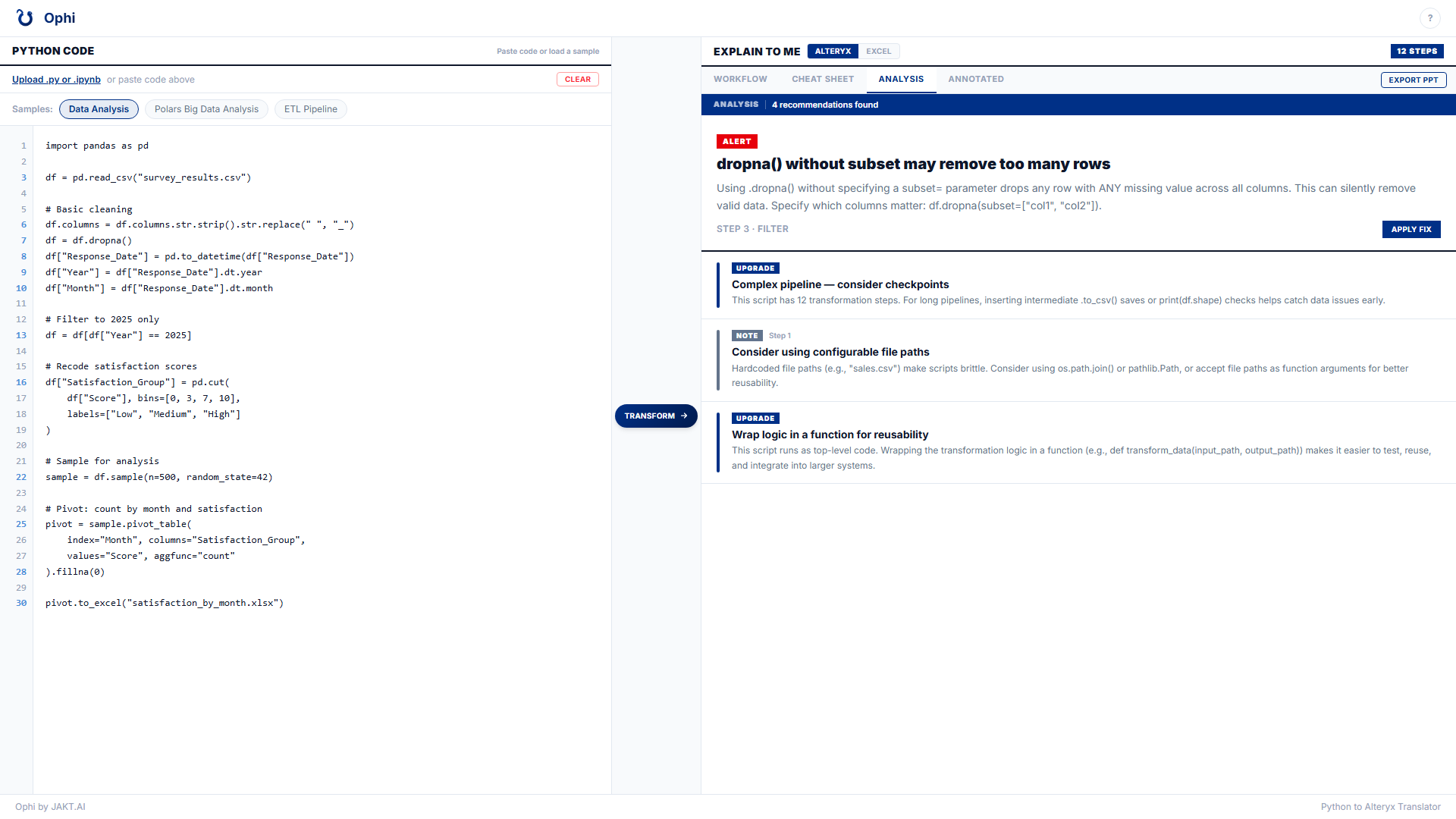 Ophi's Analysis tab catches issues your drag-and-drop tool would silently ignore — like a dropna() that removes more rows than you intended — and offers to fix it for you.