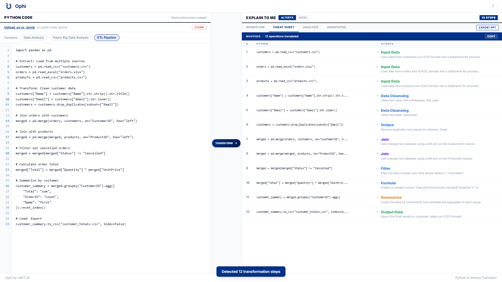 A lot of people have already started hacking at converting proprietary workflows into Python, and some of those projects are genuinely clever. But I thought about the problem from the other direction. Say you're non-technical and you get a script from ChatGPT or Claude. It runs. It produces output. But how do you trust what it did? That's what Ophi solves. You take whatever code your AI chatbot produced and Ophi translates each line into its Alteryx or Excel equivalent, so you can verify AI-generated code in the language you already think in. Not a summary. A line-by-line explanation that helps you relate each operation to the analysis you already understand.